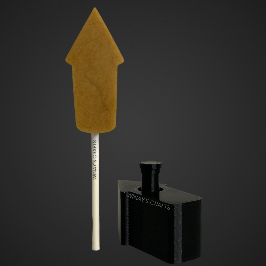 *WITH STICK GUIDE - Dip the tip of lollipop stick, paper straw or popsicle stick in melted chocolate (approximately 1/4 - 1/2 inches) AND insert in the guide in your desired position. Push the plunger up or down to pop - shaped cake pop on a stick you've got.